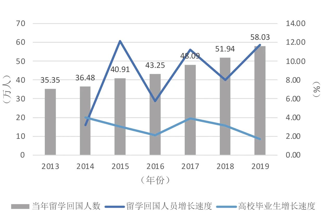 △图8:2013年-2019年留学回国人数vs当年高校毕业生人数(资料来源:留学人员数据根据教育部公开的历年《年度出国留学人员情况统计》统计;当年高校毕业生人数来自教育部每年公开的高校毕业生预计人数)