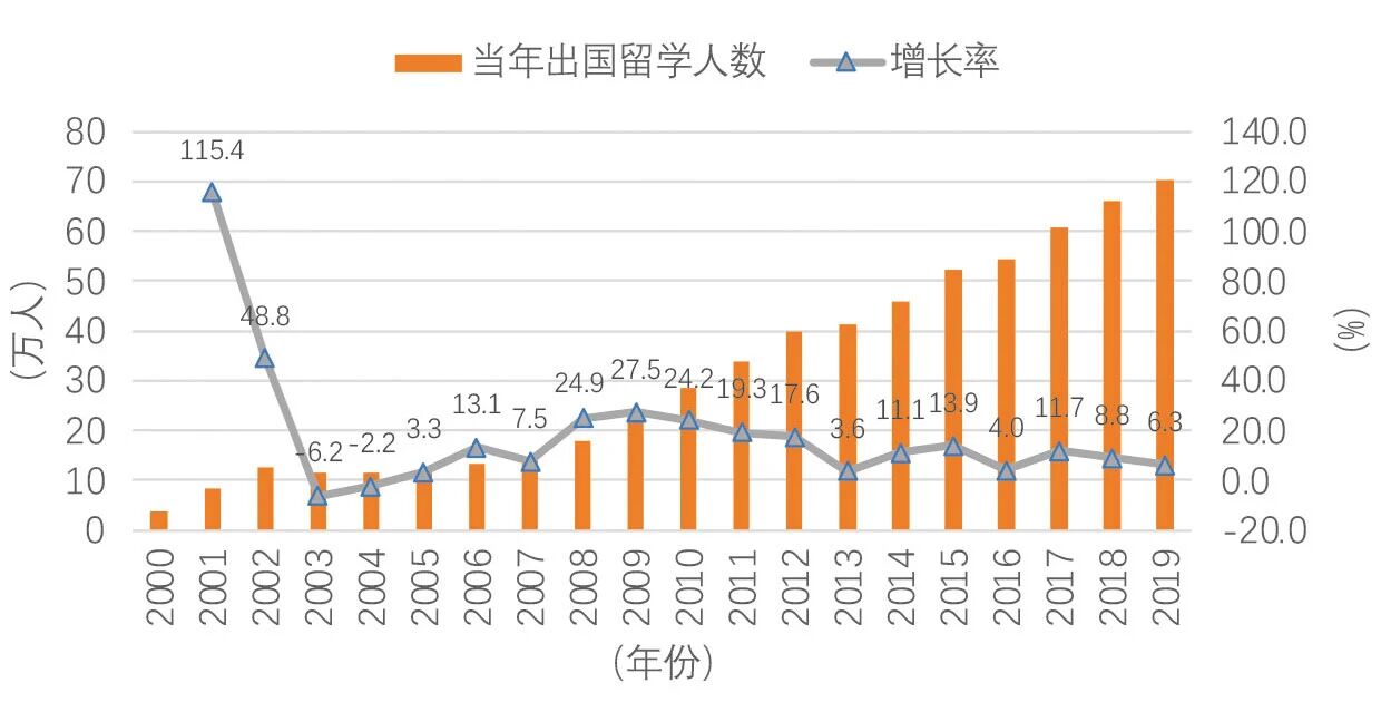 △图1:2000年-2019年中国年度出国留学人数变化(资料来源:《中国统计年鉴2010》,2010年-2019年数据为教育部年度出国留学人员情况统计)