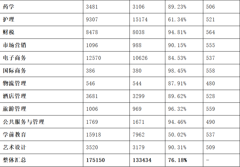 2.竞争激烈专业:学前教育升学率仅50.02%为最低,医学技术(58.66%)、护理(61.34%)、数字媒体(62.45%)等热门专业因报考人数多,升学率偏低。